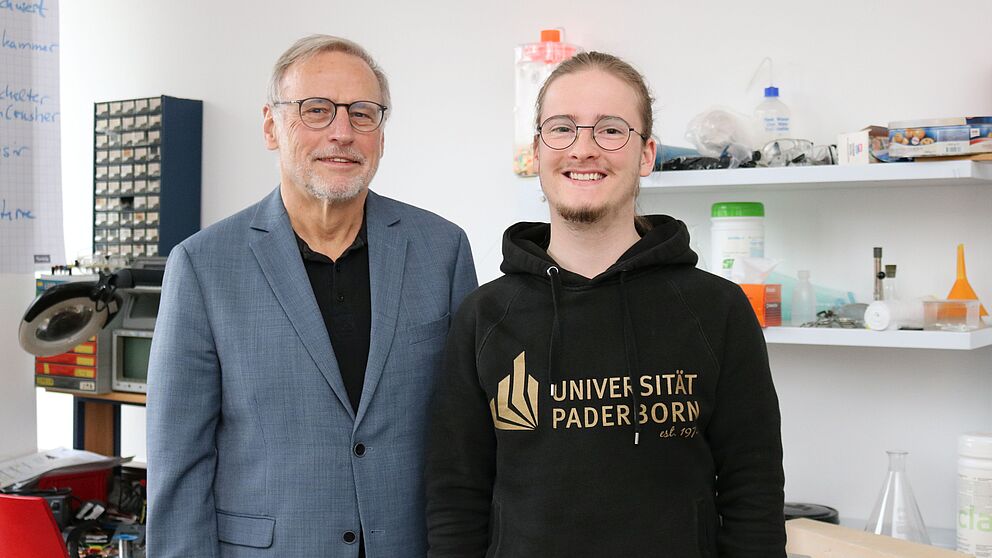 Foto (Universität Paderborn, Alexandra Dickhoff): Prof. Dr. Volker Peckhaus (l.), Beauftragter des Präsidiums der Universität Paderborn für Alumni-Angelegenheiten, gratuliert dem Emeriti-Preisträger 2024 Tristan Bökenföhr (r.) in der Werkstatt der Paderborner Event-Physik. Dort werden unter anderem die Experimente für die beliebten Wissenschaftsshows vorbereitet.