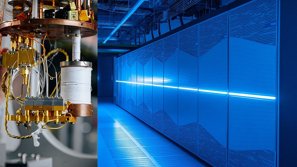 Foto (Universität Paderborn, Hennig/Mazhiqi): Wissenschaftler der Universität Paderborn haben zum ersten Mal Hochleistungsrechnen (rechts im Bild der Paderborner Supercomputer Noctua) zur Analyse eines Quantenphotonikexperiments im großen Maßstab eingesetzt.