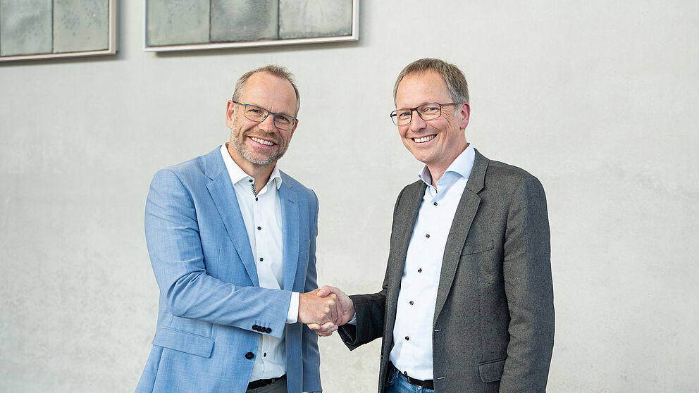 Foto (Universität Paderborn, Jonas Fromme): Der scheidende Dekan Prof. Dr. Burkhard Hehenkamp (rechts) wünscht seinem Nachfolger, Prof. Dr. Jens Müller, und dem neuen Dekanatsteam viel Erfolg für die bevorstehenden Aufgaben.