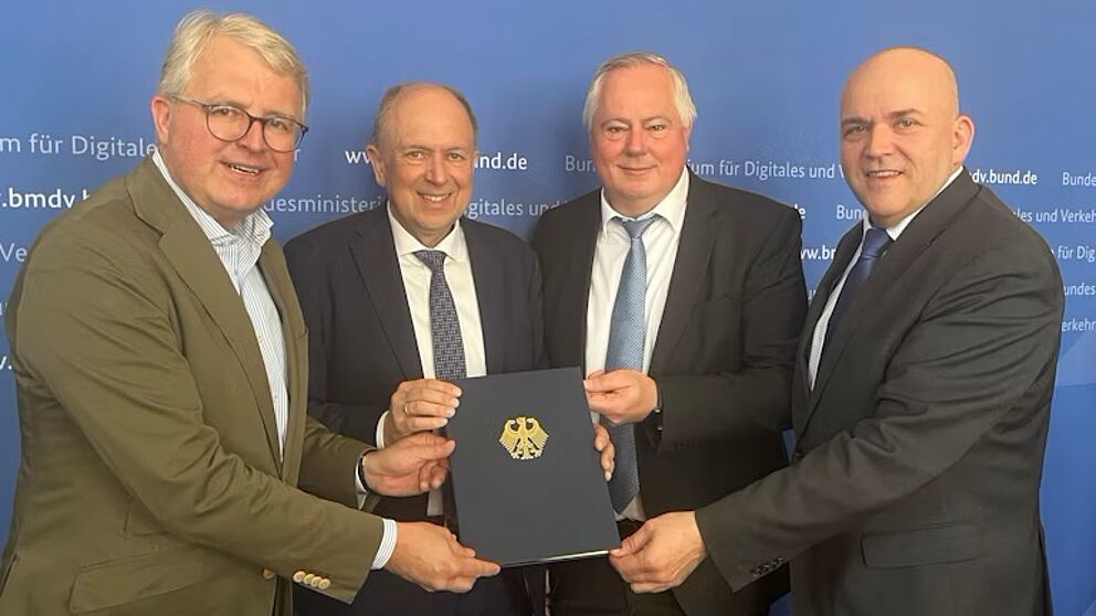 Foto (Innovationsflughafen PAD): Große Freude bei der Übergabe der Bundesförderung in Berlin (v. r.): Flughafen-Geschäftsführer Roland Hüser, Projektkoordinator Stefan Schröder, Flughafen-Aufsichtsratsratsvorsitzender Landrat Christoph Rüther und Bundestagsabgeordneter Frank Schäffler.