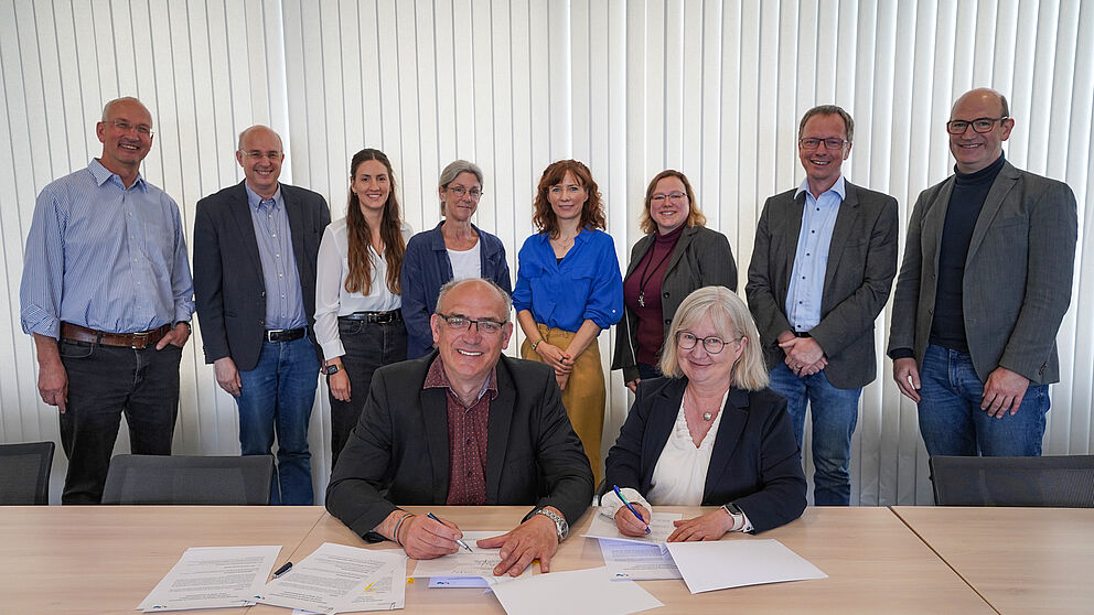 Foto (Universität Paderborn): (vorne v. l.) Associate Provost Dr. Martin Kagel, Office of Global Engagement der University of Georgia, und Simone Probst, Vizepräsidentin für Wirtschafts- und Personalverwaltung der Universität Paderborn, freuen sich über die Vertragsunterzeichnung. (hinten v. l.) Prof. Dr. Rüdiger Kabst, Prof. Dr. Burkhard Hehenkamp, Prof. Dr. Christoph Ehland, Prof. Dr. Stefan Jungblut, Julia Winkelmann und Stefan Schwan.