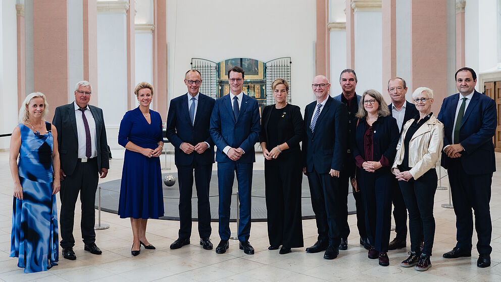 Foto (Land NRW / Marius Becker): Prof. Dr. Christine Silberhorn (4. von rechts) stellte dem Bundeskanzler und der NRW-Landesregierung die Stärken, Potenziale und Herausforderungen der Quantentechnologien vor.