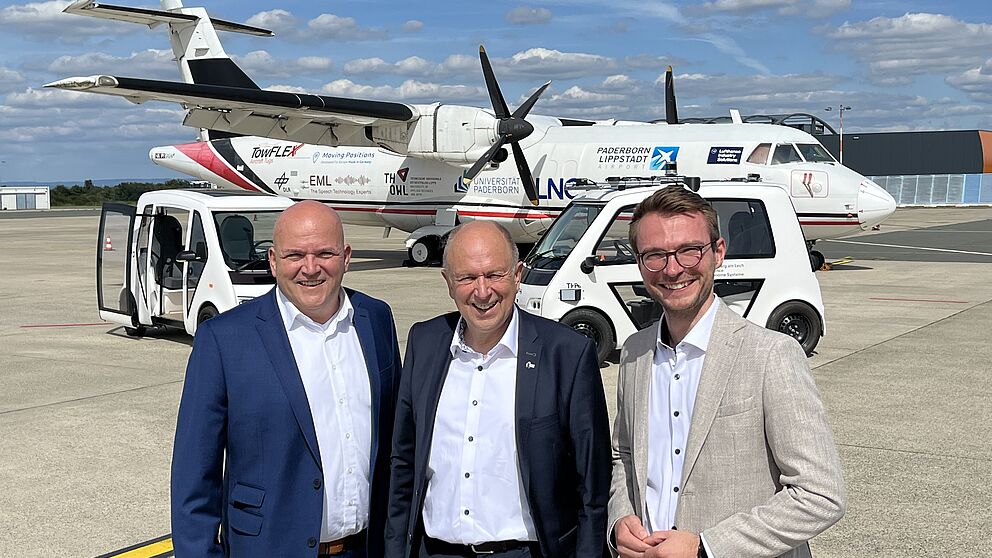 Foto (NeMo e.V.): Start für die automatisierten Testfahrten der Neuen Mobilität Paderborn (von links): Flughafen-Geschäftsführer Roland Hüser, Flughafen-Aufsichtsratsvorsitzender Landrat Christoph Rüther und NeMo-Geschäftsführer Jonathan Behm.
