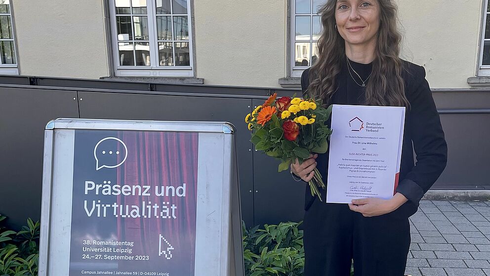 Dr. Lina Wilhelms wurde am Sonntag, 24. September, für ihre Promotion an der Universität Paderborn vom Deutschen Romanistenverband mit dem Elise Richter-Preis ausgezeichnet.