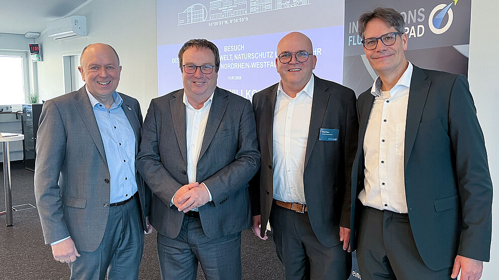 Bei einem Besuch am Flughafen Paderborn-Lippstadt hat sich NRW-Verkehrsminister Oliver Krischer über aktuelle Maßnahmen zur Dekarbonisierung sowie geplante Innovationen informiert. Prof. Dr. René Fahr, Vizepräsident für Transfer und Nachhaltigkeit, stellte die Initiative „Innovationsflughafen PAD“ vor.