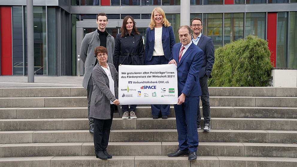 Foto (Heiko Appelbaum): Haben die Pflanzung der ersten Douglasie im Campuswald begleitet: (vorne) Dennis Kehne (Hochschulsport), Philip Fortströer (Revierförster), (hintere Reihe, v. l.) Christina Mensch (AStA), Claudia Warnecke (Technische Beigeordnete), Jessica Schütte (Amt für Umweltschutz und Grünflächen), Nikolas Osburg (Gemeindeforstamt Willebadessen), Simone Probst (Vizepräsidentin für Wirtschafts- und Personalverwaltung, Universität Paderborn), Richard Hesse (Stiftung), Karl-Julius Sänger (Techniker Krankenkasse), und Sandra Bischof (Gesunde Hochschule).