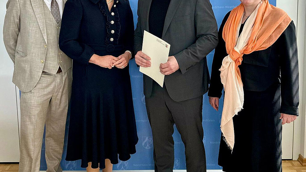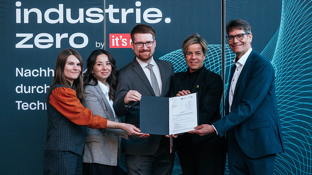 Foto (it’s OWL): (v. l.) Die Paderborner Wissenschaftler*innen Lisa Petzke, Anja Rasor und Dr.-Ing. Christian Koldewey mit Mona Neubaur und Prof. Dr. René Fahr bei der Übergabe des Förderbescheids für das Projekt „GoProZero“.
