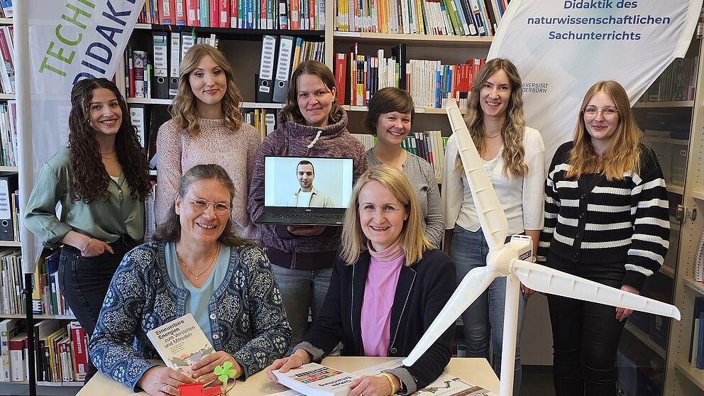 Foto (Universität Paderborn): Das transMINT4.0-Projektteam in Vorbereitung auf die Bifo 2025: Die studentischen und wissenschaftlichen Mitarbeitenden Hannah Leonie Fritz, Marie-Sophie Vüllers, M.Ed. Eileen Reckmann, M.Sc. Lena Luise Crummenerl, Kristin Schmidt, Madlin Rodehorst (von links stehend), vorne sitzend von links: Prof. Dr. Katrin Temmen und Prof. Dr. Eva Blumberg. Krankheitsbedingt als Bildschirmfoto: M.Ed. Ricardo Puppe. Es fehlt Marena Meier.