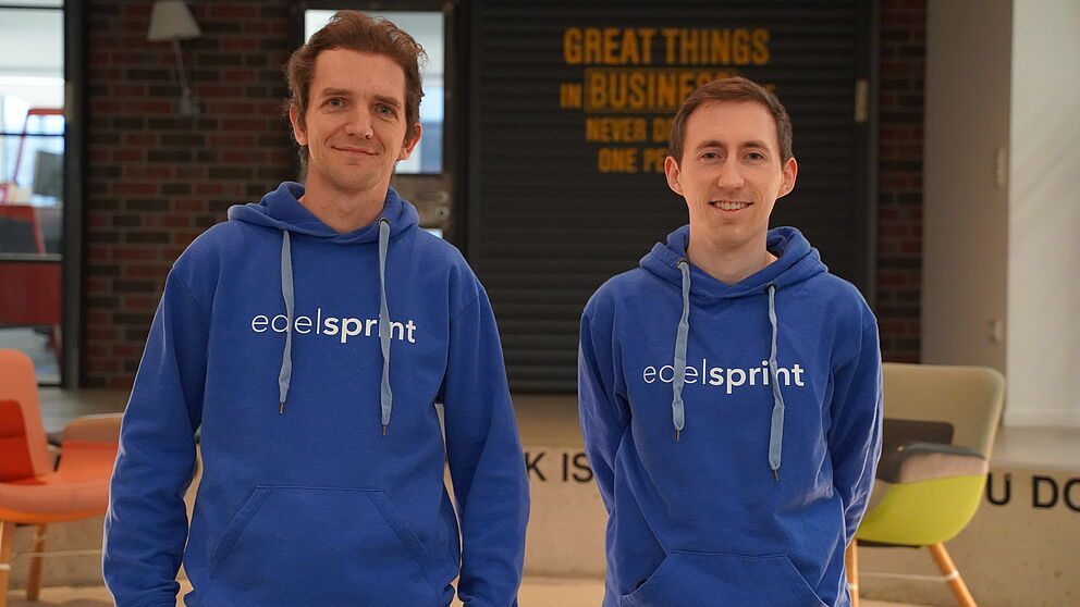 Foto (TecUP): Das Team von „edelsprint“ in der Arena der garage33, dem Gründungsinkubator der Universität Paderborn. Adrian Hülsmann und Christian Klaussner (v. l.) haben ein Onlinetool für agiles Projektmanagement nach der Scrum-Methode entwickelt.
