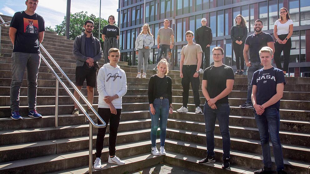 Foto (Universität Paderborn, Jennifer Strube): Sind gespannt auf ihre Ausbildung in Paderborn: Die neuen Auszubildenden der Universität mit Ausbildungskoordinator Norbert Bornhorst (hintere Reihe, Dritter von links).