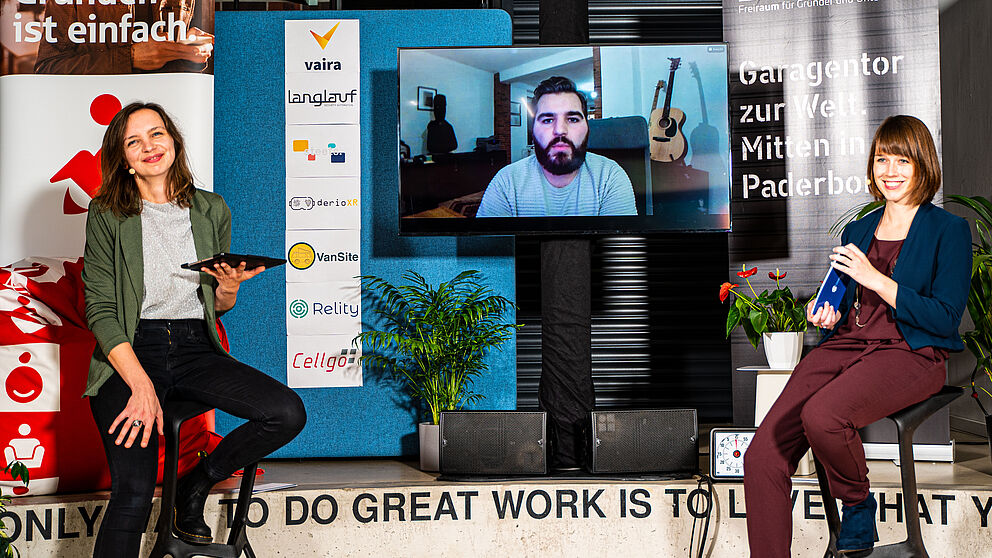 Foto (TecUP): Beim „OWL Start-up Pitch 2020“ präsentierte sich u. a. das Team von „VanSite“, einer erfolgreichen Ausgründung der Universität Paderborn, dessen Team die Leidenschaft für das Thema Camping eint. V. l. Carola Pense (Eventmanagerin im TecUP) und Carla Duitmann (Netzwerkmanagerin im TecUP) im Gespräch mit Sebastian Siegbert (Gründer und Geschäftsführer von „VanSite“).