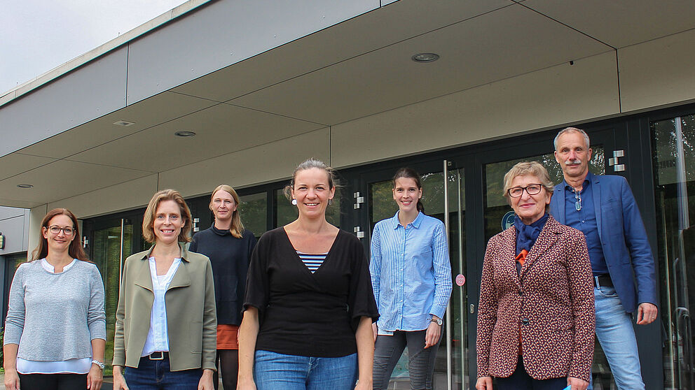 Foto (Uni Paderborn, Simon Ratmann): Das Team des Forschungsprojekts: v. l. Sandra Bischof (Leiterin der „Gesunden Hochschule“, Universität Paderborn), Prof. Dr. Miriam Kehne (Leiterin des Arbeitsbereichs „Kindheits- und Jugendforschung im Sport“, Universität Paderborn), Anne Strotmeyer (wissenschaftliche Mitarbeiterin, Universität Paderborn), Antje Tarampouskas („Zentrum für Bildungsforschung und Lehrerbildung – PLAZ-Professional School“ der Universität Paderborn), Anna-Lena Sting (wissenschaftliche Mitarbeiterin, Hochschule Hannover), Dr. Brigitte Steinke (Techniker Krankenkasse) und Prof. Dr. Mathias Bonse-Rohmann (Hochschule Hannover).