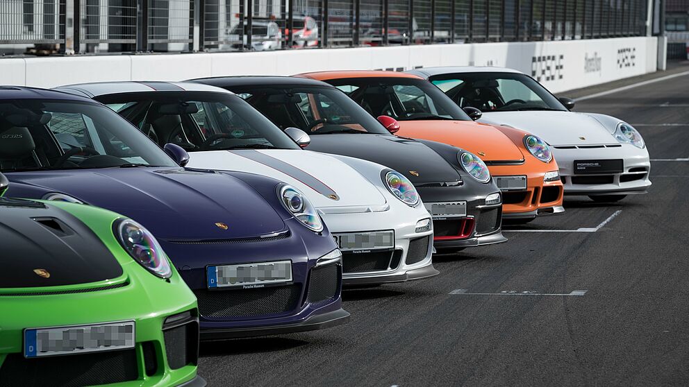 Foto (Dr. Ing. h.c. F. Porsche AG, Media Gallery, Rossen Gargolov): Verschiedene Ausgaben des Porsche 911 GT3 RS (Generation Range) stehen aufgereiht nebeneinander. Produkte wie diese könnten künftig noch systematischer und kostensparender in Generationen entwickelt werden. Dazu erarbeiten Paderborner und Karlsruher Wissenschaftler einen Leitfaden.