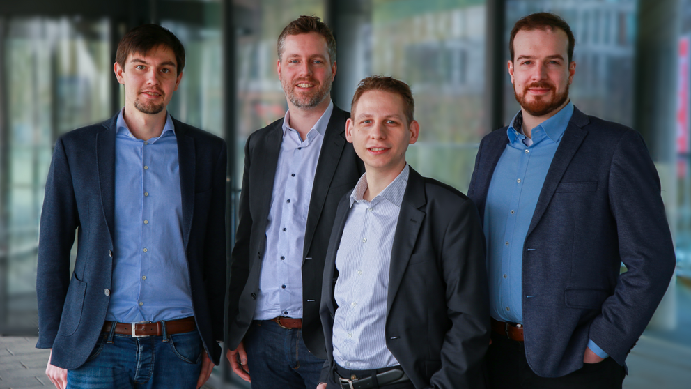 Foto (Fraunhofer IEM): Das Gründungsteam von CodeShield: Dr. Johannes Späth, Prof. Eric Bodden, Andreas Dann und Manuel Benz bringen die Ergeb-nisse ihre IT-Security-Forschung am Heinz Nixdorf Institut der Universität Pa-derborn und am Fraunhofer IEM in die Praxis.