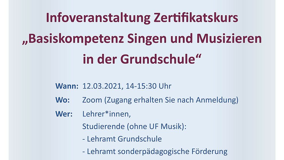 Am Freitag, 12. März, findet von 14 bis 15.30 Uhr via Zoom eine digitale Infoveranstaltung zum dritten Durchgang des Zertifikatsprogramms „Basiskompetenz Singen und Musizieren in der Grundschule“ (BaSiMusiG), das im Sommersemester 2021 starten wird, statt. Anmeldungen sind bis zum 7. März per E-Mail an Bianca Düsterhaus (biancam(at)mail.uni-paderborn(dot)de) möglich. Die Zugangsdaten zum Zoom-Meeting werden nach erfolgter Anmeldung mitgeteilt.