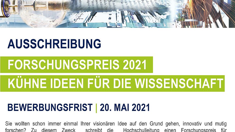 Die Hochschulleitung schreibt einen Forschungspreis für Wissenschaftler*innen aus, mit dem außergewöhnliche Forschungsprojekte abseits des Mainstreams gefördert werden sollen. Neben Forschungsprojekten mit visionären Ideen, gewagten Hypothesen, kreativen und unkonventionellen Technologien soll der Aspekt der Interdisziplinarität besondere Beachtung finden. Das Preisgeld in Höhe von 150.000 Euro steht für einen Zeitraum von 1,5 Jahren zur…