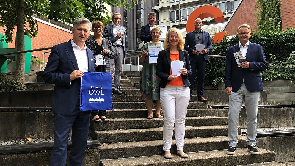 Foto (Universität Paderborn, Marc Schüle): v. l.: Ansgar Käter (VerbundVolks-bank OWL), Prof. Dr. Birgitt Riegraf (Präsidentin Universität Paderborn), Christoph Schön (Stabsstelle Hochschulnetzwerk und Fundraising, Universität Paderborn) Sylvia Looks (CLAAS Stiftung Harsewinkel), Sigrun Weigel (Vauth-Sagel Brakel), Markus Schoisswohl (HEGLA GmbH Beverungen), Peter Herrmann (HEGLA GmbH Beverungen) Bernd Schäfers-Maiwald (dSPACE Paderborn).