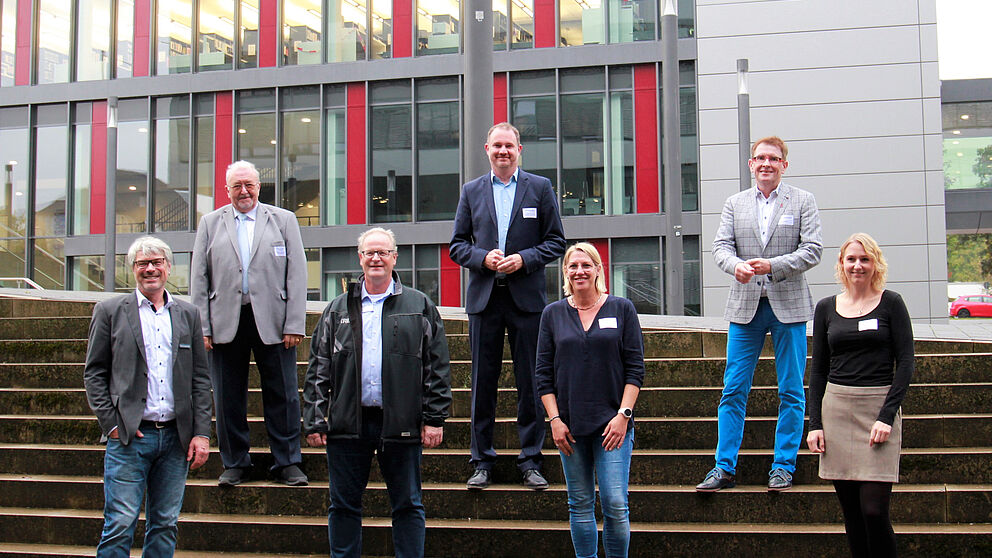Foto (Universität Paderborn): Beim 7. Symposium BGM: vorne von links nach rechts: Prof. Dr. Heiko Meier (Universität Paderborn), Wolfgang Krenz (Krenz Autoservice GmbH), Simone Müller-Data (Müller Elektronik Salzkotten), Lisa Sennefelder (Universität Paderborn); hinten von links nach rechts: Prof. Dr. Siegmar Bornemann (Praenet), Christian Stork (Schlosspark und Lippesee GmbH) und Hans-Joachim Meier (Praenet).
