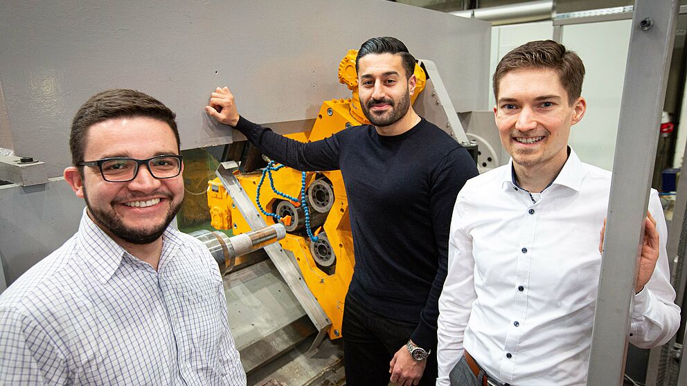Foto (Fraunhofer IEM): Arbeiten an einem intelligenten Drückwalzprozess: V. l. Julian Rozo Vasquez (WPT, Technische Universität Dortmund), Bahman Arian (LUF, Universität Paderborn) und Markus Riepold (Fraunhofer IEM) vor dem Umform-Prüfstand der Universität Paderborn.