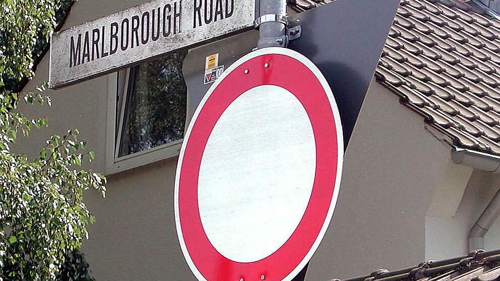Foto (Helmut Michelis): An vielen Orten mischten sich deutsche und britische Einflüsse. Dieses Foto ist im ehemaligen Joint Headquarters in Mönchengladbach-Rheindahlen aufgenommen worden. In der dortigen Siedlung für britische Familien gab es englische Straßennamen und es galt die deutsche Straßenverkehrsordnung.